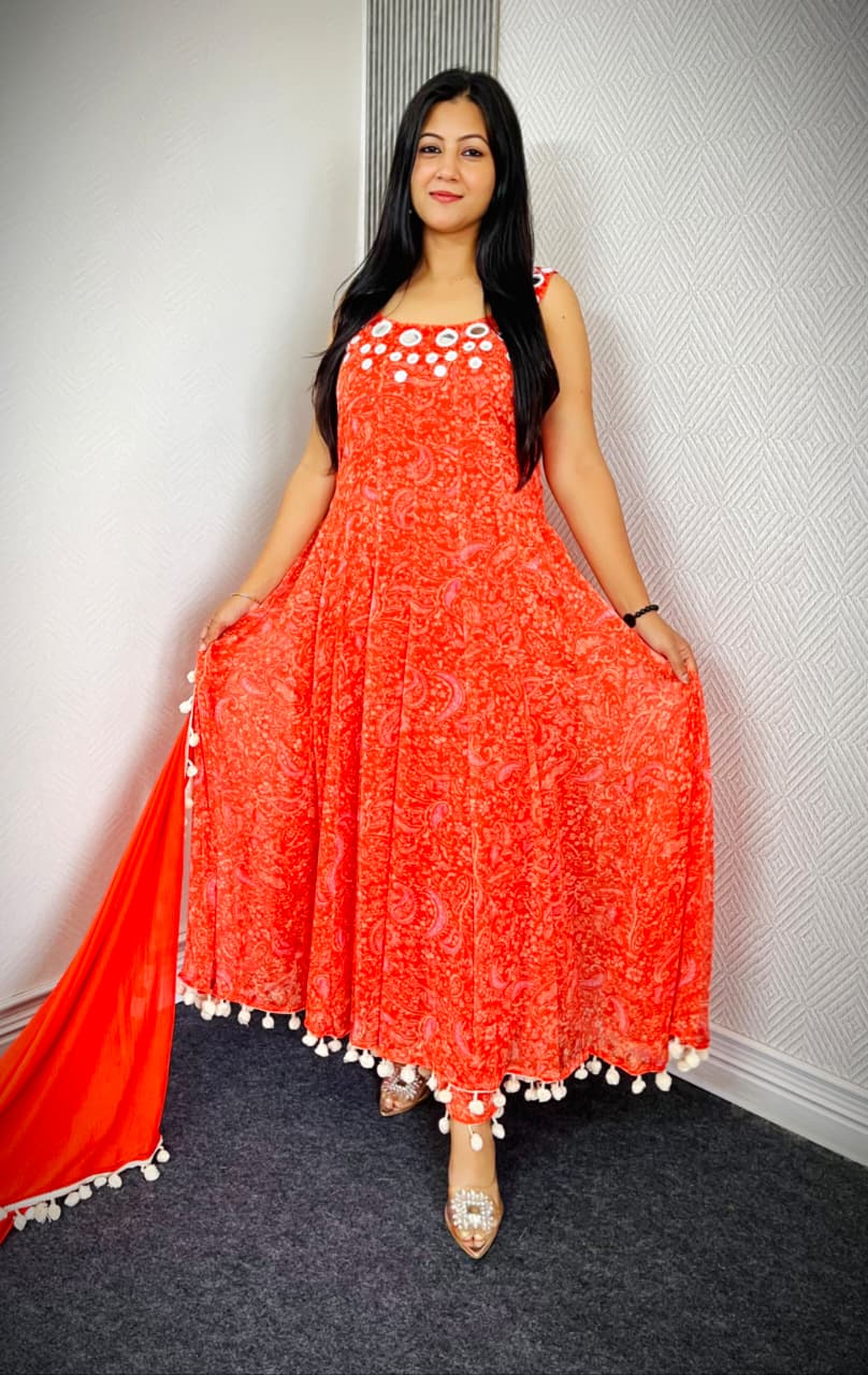 Grace your ethnic collection with this stunning floral print Anarkali suit, crafted in lightweight fabric for a flowy and elegant look. The floral design on a orange base adds a refreshing touch, while the sleeveless Anarkali silhouette ensures modern charm. Paired with matching palazzo pants and a solid orange dupatta finished with playful tassels, this outfit is perfect for summer celebrations, festive gatherings, and casual outings.
